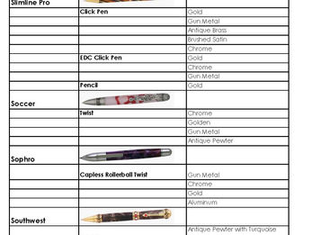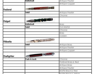 You can customize any pen or pencil with a wide variety of wood or acrylic colors. Many of the choices for pens/pencils and their spools are below. Due to the many choices available, not all pens/pencils and spools are shown. If you don't see what you are looking for please contact us.